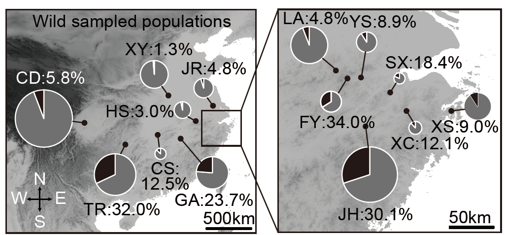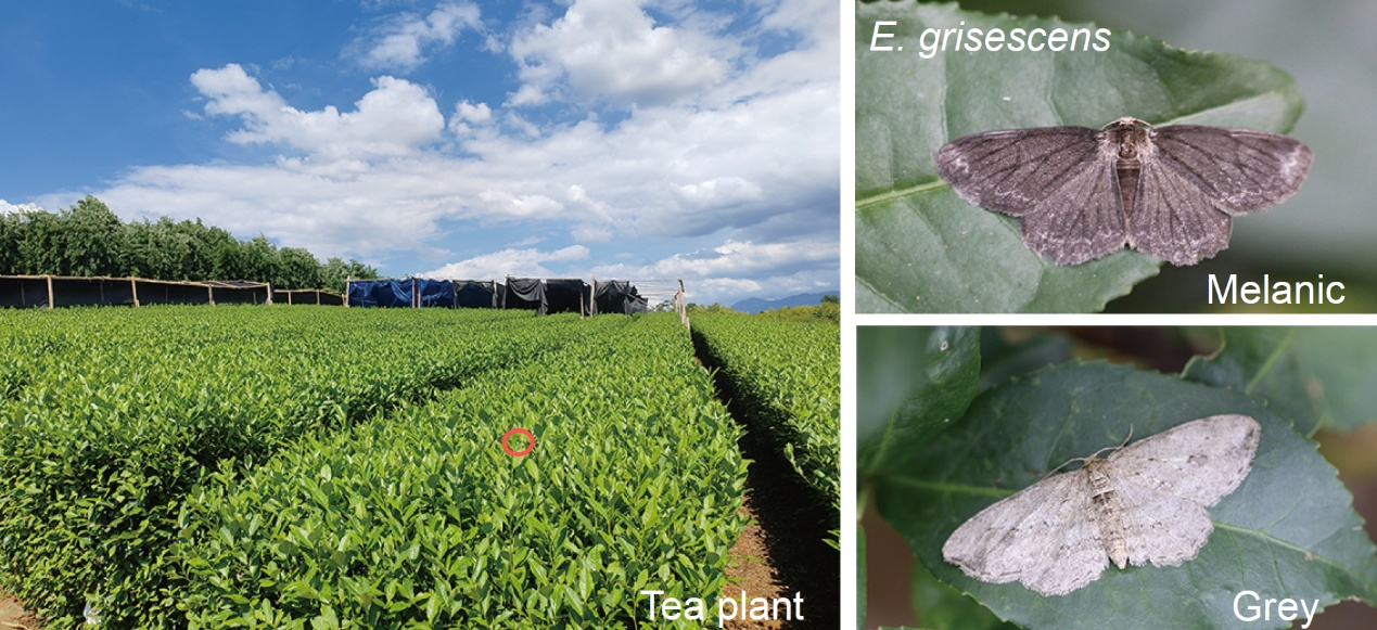The tea geometrid (Ectropis grisescens) is a major tea pest widely distributed in the tea gardens of East Asia, with both melanic and gray morphs in nature. Unlike peppered moths that rest on tree bark that is relatively exposed to predators, tea geometrids inhabit densely grown tea plants, whose trunks are fully sheltered by leaves and twigs. In other words, the environment of tea gardens provides minimal camouflage benefits for both morphs. This system thus offers a unique model to study the impacts of multiple ecological factors on melanism in the absence of strong natural selection.