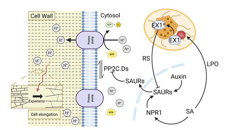 SA inhibits hypocotyl elongation via LPO and 1O2 production. SA-induced LPO triggers a 1O2 burst, activating EX1-dependent retrograde signaling (RS), which represses auxin-mediated hypocotyl elongation. In the absence of SA, auxin promotes elongation by inducing SAURs (e.g., SAUR19 and SAUR63), which inhibit PP2C.D phosphatases. This maintains phosphorylation of plasma membrane H⁺-ATPase 2 (AHA2), enhancing proton extrusion, apoplastic acidification, EXPANSIN activation, K⁺ uptake, turgor pressure, and cell expansion. Under SA treatment, NPR1 maintains auxin-related gene expression, antagonizing EX1-mediated RS. In npr1 mutants, SA-induced LPO increases 1O2 and alters detoxification gene expression, amplifying EX1-dependent repression of auxin genes and reducing hypocotyl elongation. Loss of EX1 significantly restores elongation in npr1 seedlings.